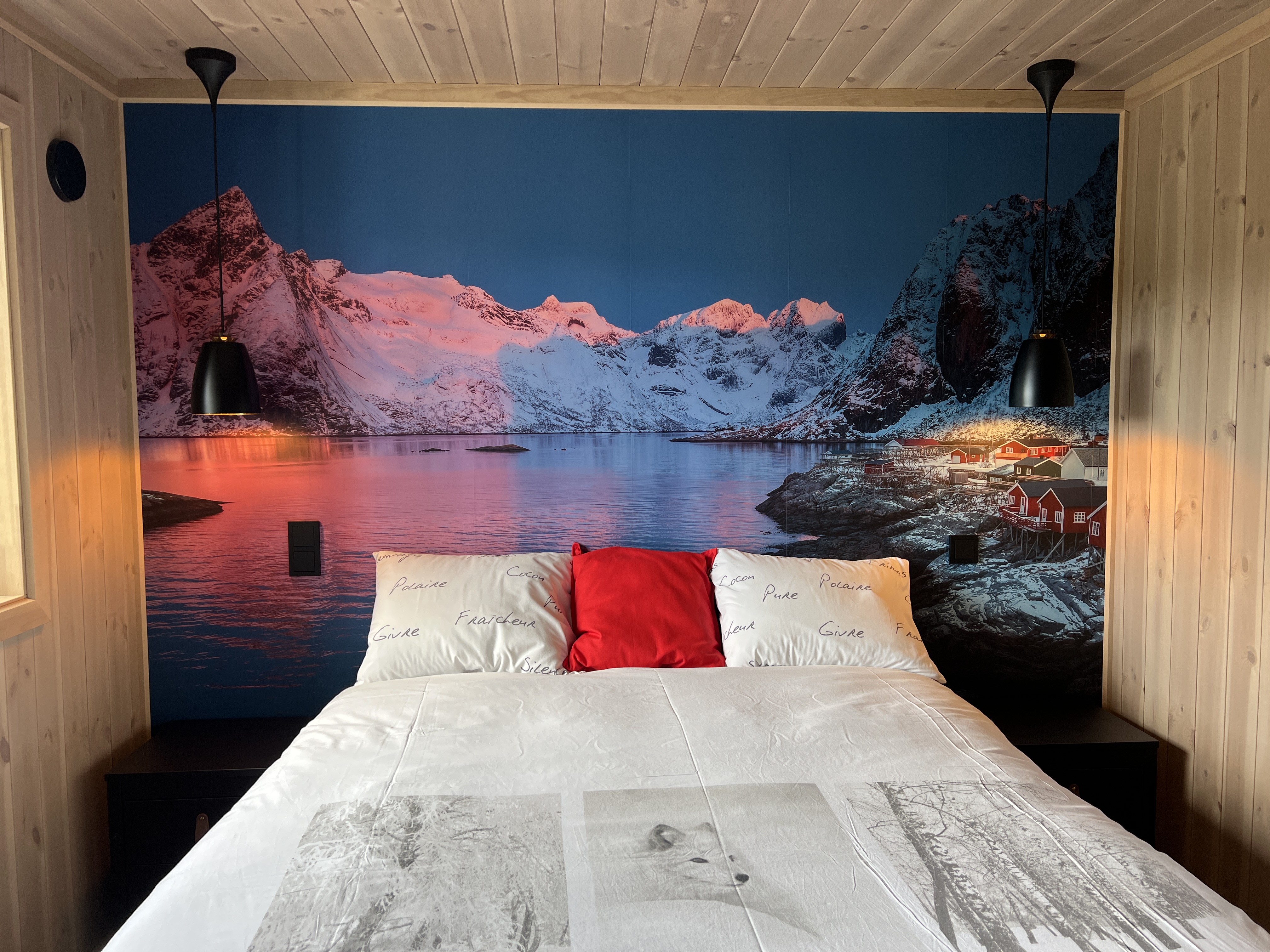Chambre Lofoten : c’est la plus belle chambre du chalet, ell est située au RDC. Chambre pour 2 personnes de 9,3 m2 avec lit double 150, le papier peint et les tirages photo représentent les paysages emblématiques des Lofoten. Chambre avec la plus grande fenêtre et la plus belle vue du chalet sur la mer et les montagnes.