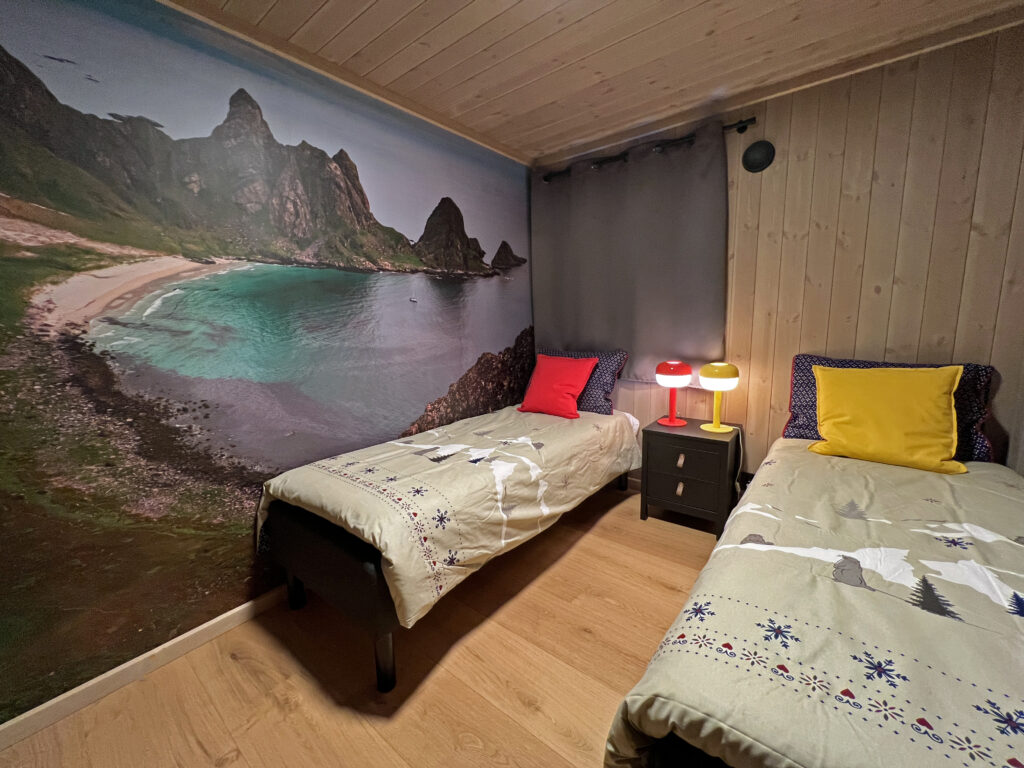 Chambre Vesterålen : chambre pour 2 personnes de 7,3 m2 avec 2 lits simples située au RDC, c’est la plus petite des 4 chambres disponibles dans le chalet. Le papier peint et les tirages photo représentant les paysage emblématiques des Vesterålen et d’Andøya. Seule chambre avec vue au nord pour voir les aurores !
